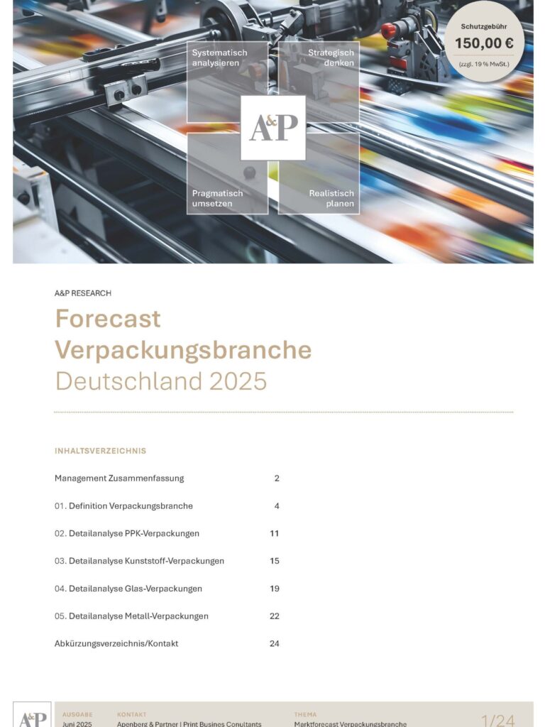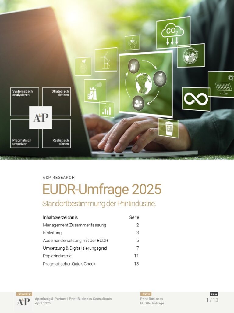 Apenberg & Partner veröffentlicht regelmäßig Studien, White Paper und Arbeitshilfen zu aktuellen Themen der Druckindustrie. Außerdem finden Sie hier auch die Handouts zu Vorträgen, die unsere Berater zu diesen Themenfeldern halten. Sie können sich die meisten der Papiere kostenfrei downloaden. Wenige Studien und White Paper sind kostenpflichtig. Hierauf weisen wir Sie jeweils gesondert hin. In diesen Fällen nutzen Sie bitte den jeweiligen E-Mail-Link für Ihre Bestellung.
